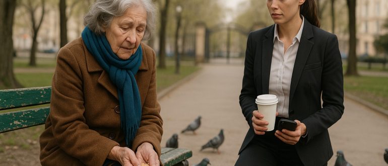 Жената на пейката в парка продължаваше да храни гълъбите с треперещи ръце, докато Ема не осъзна, че възрастната дама пази целия пресен хляб за някой, който никога не