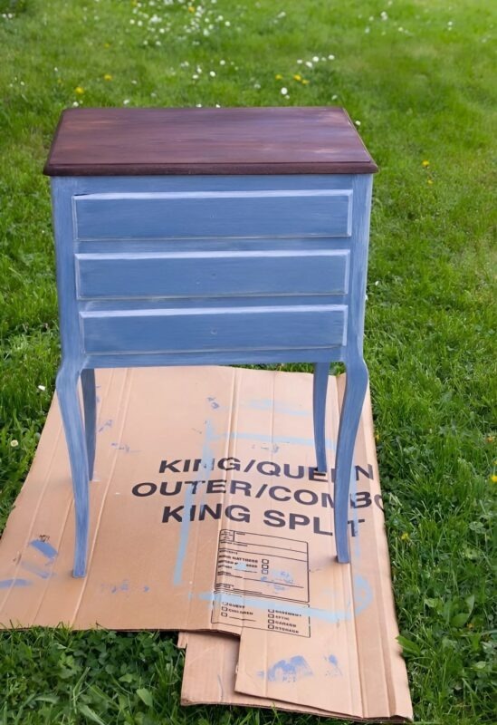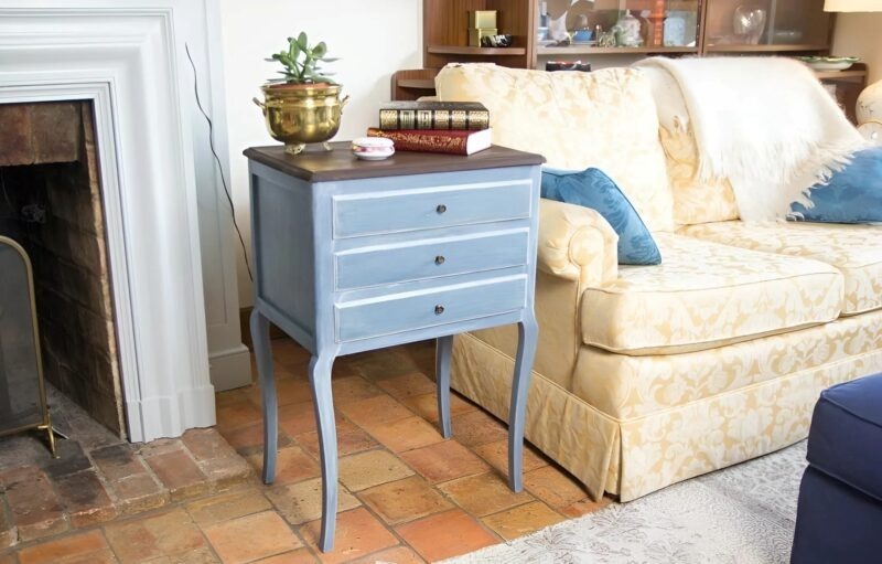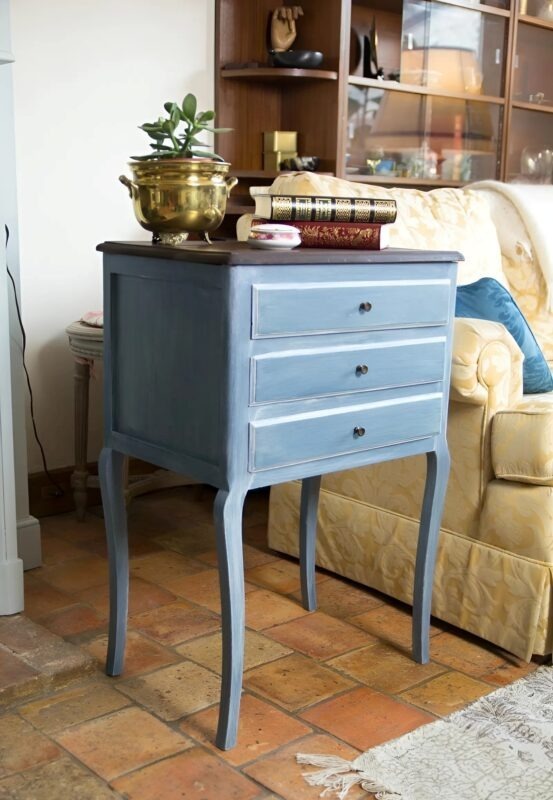 Искахме тази маса да се откроява, затова й придадохме драматичен нов вид. Повърхността беше оцветена в топъл тъмен орехов нюанс, за да се подчертае богатството на дървесните влакна. За основата избрахме смело пруско синьо, леко износено с бели акценти, за да се подчертае формата и дълбочината й.
