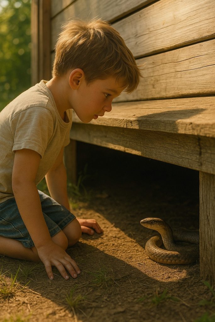 Излязох, наведох се — и застинах. В сянката, между старите дъски, лежеше змия. Дълга, лъскава, с красив рисунък по гърба. Не се движеше, само ни наблюдаваше със спокойни кехлибарени очи.