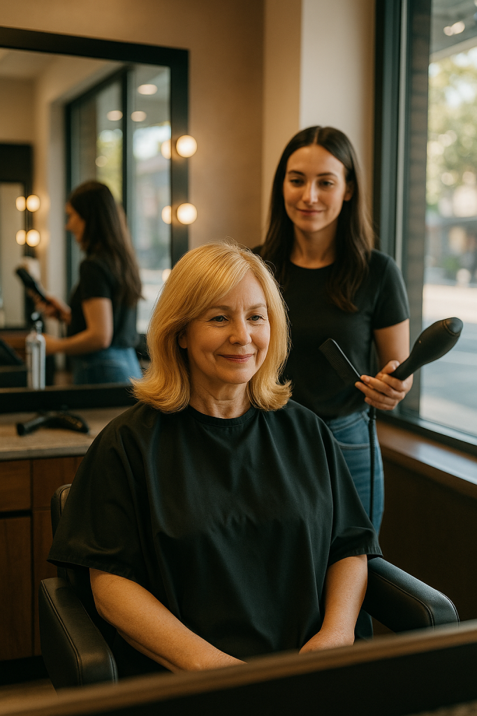Салонът беше шумен, ухаеше на боя и кафе. В огледалата се отразяваха чужди разговори, блестящи сешоари и живот, който звучеше по-шумно, отколкото ѝ се искаше.