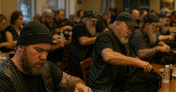 Двадесет мотористи влязоха в ресторанта. Кожени якета, татуировки, бради, тежката миризма на бензин и бира – появата им предизвика мигновена тишина. Клиентите замръзнаха, някои дори се изправиха, готвейки се да избягат. Собственичката на ресторанта, бледа, се опита да се приближи до тях, но гласът ѝ трепереше.