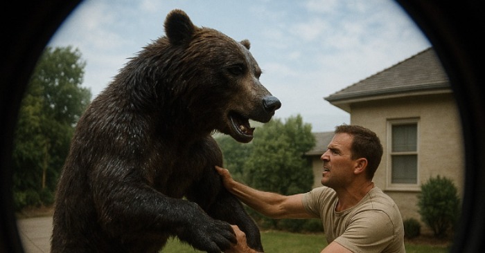 Точно пред къщата си, на тротоара, мъж се бореше с мечка. Истинска, огромна, с мокра кафява козина, блестяща на слънцето. Мъжът – висок, с дрипаво яке – държеше желязна тръба и се опитваше да отблъсне звяра, който се носеше към него, ръмжейки и оголвайки зъби.