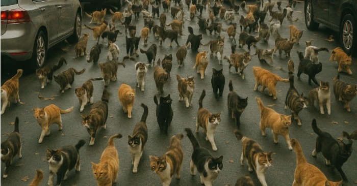 Една по една, котките започнаха да излизат от отворената врата. Не две, не пет – само през първите няколко минути бяха петдесет. Космати, раирани, безопашати, червени, бели, черни, с едно око, с гризано ухо – всяка уникална. Но всички се движеха в колона, рамо до рамо, към главния път на града – B-17.