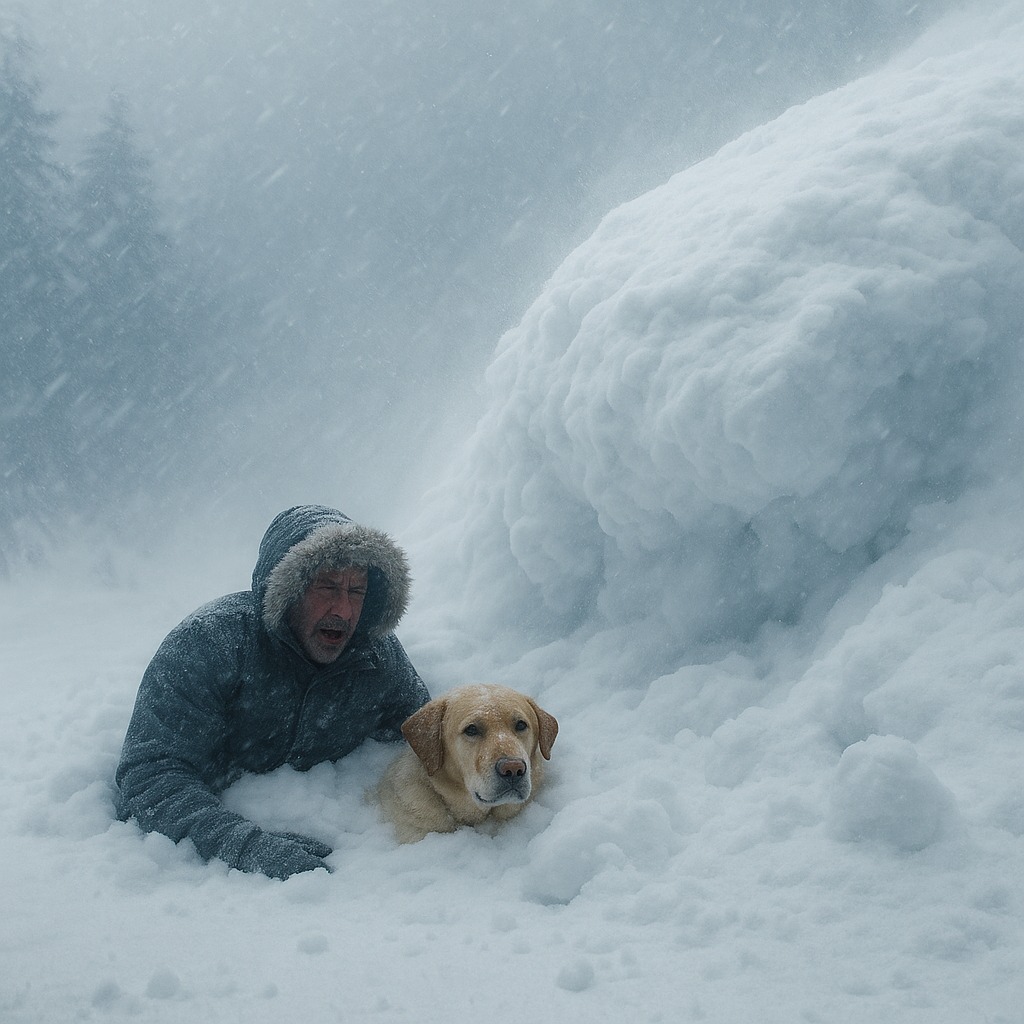 Снегът го прикова към земята, пречейки му да се движи. Тишина и мрак го обгръщаха. Беше невъзможно да диша; въздухът бързо свършваше. Той се опита да освободи ръцете си, но снегът ставаше все по-гъст. Паниката се надигаше, когато изведнъж през гъстия сняг се чу слабо хленчене.
