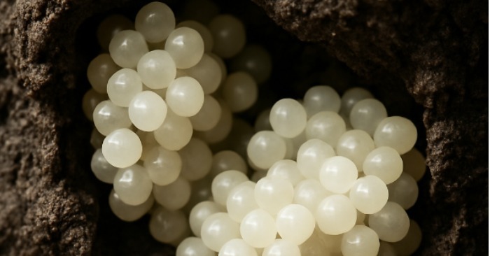 За да се увери, тя внимателно отлепи горния слой пръст. И тогава видя, че белите, кръгли форми са подредени в уплътнена камера – сякаш някой нарочно е построил гнездо около тях. Земята беше плътно утъпкана, като малка пещера – спретната, сякаш изработена на ръка… или от някой също толкова умел.