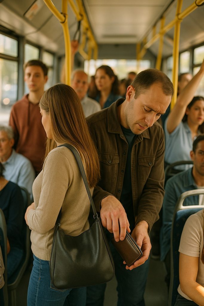 Чантата се отвори леко. Ципът се плъзна. Портфейлът изчезна – плавно, тихо, сякаш просто беше част от движението на автобуса. Жената не усети нищо. Но един човек го видя. Млад мъж на около двадесет години, със слушалки на врата, стоеше леко встрани. Той забеляза всичко – ръката, която се плъзгаше по чантата, отварянето на ципа, портфейла, който сменяше собственика си.