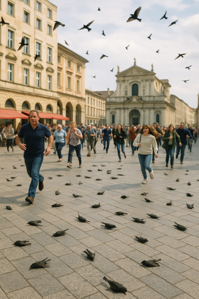 Първо всички видяха една птица да пада отгоре. После още няколко. И няколко секунди по-късно, тъмен рояк сякаш висеше над площада, бързо се спускайки. Хората се шмугваха ужасени – сякаш небето буквално е „паднало“.