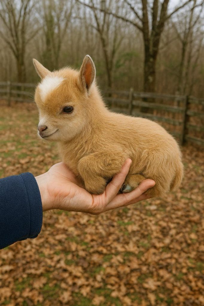 Това беше най-малката коза, която Майрън някога беше виждал. Той я намери рано една сутрин точно на портата на фермата – мъничка топка червена козина, седнала на студената земя, тихо пищяща, сякаш викаше майка си. Бебето беше толкова леко, че се побираше в дланта на Майрън, като мека играчка.