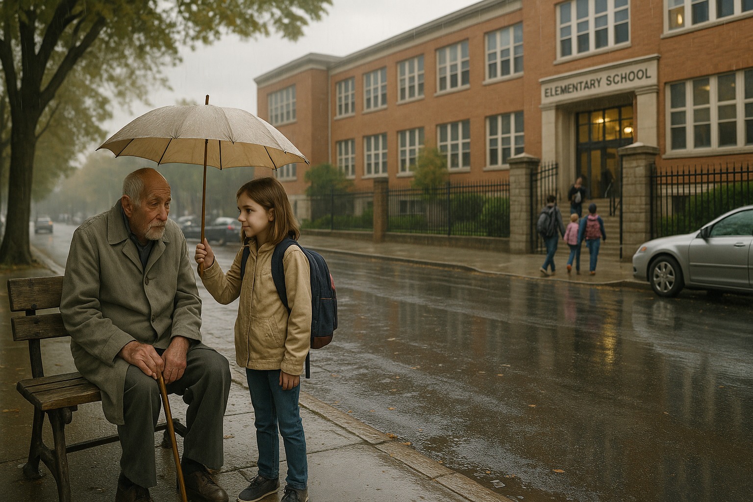 Той седеше на същата счупена пейка срещу училището, слаба фигура в избеляло сиво палто. Децата тичаха покрай него всеки ден, смеейки се, блъскайки се, спорейки за домашни. Родителите проверяваха телефоните си, натискаха клаксони от колите, размахваха раници във въздуха. Само той стоеше неподвижно, с ръце, скръстени на дървен бастун, очи, залепени за портата, сякаш чакаше някой, който винаги закъснява.