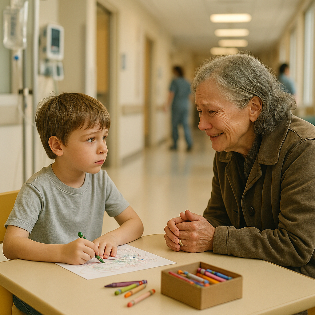 На втория ден дребна, трепереща жена влезе бързо в педиатрията, стискайки стара чанта до гърдите си. Косата ѝ беше посивяла на слепоочията, ръцете ѝ бяха червени от студ. Тя огледа коридора, докато погледът ѝ не се спря на Лиъм, който оцветяваше сам на маса с дарени пастели.