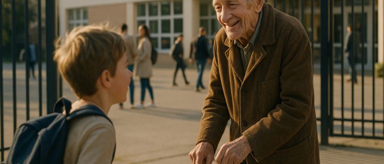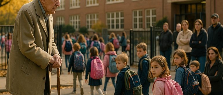 Старецът стоеше на училищната порта всеки следобед, докато синът ми не се прибра с часовника си и въпрос, който разби сърцето ми. За първи път го забелязах в
